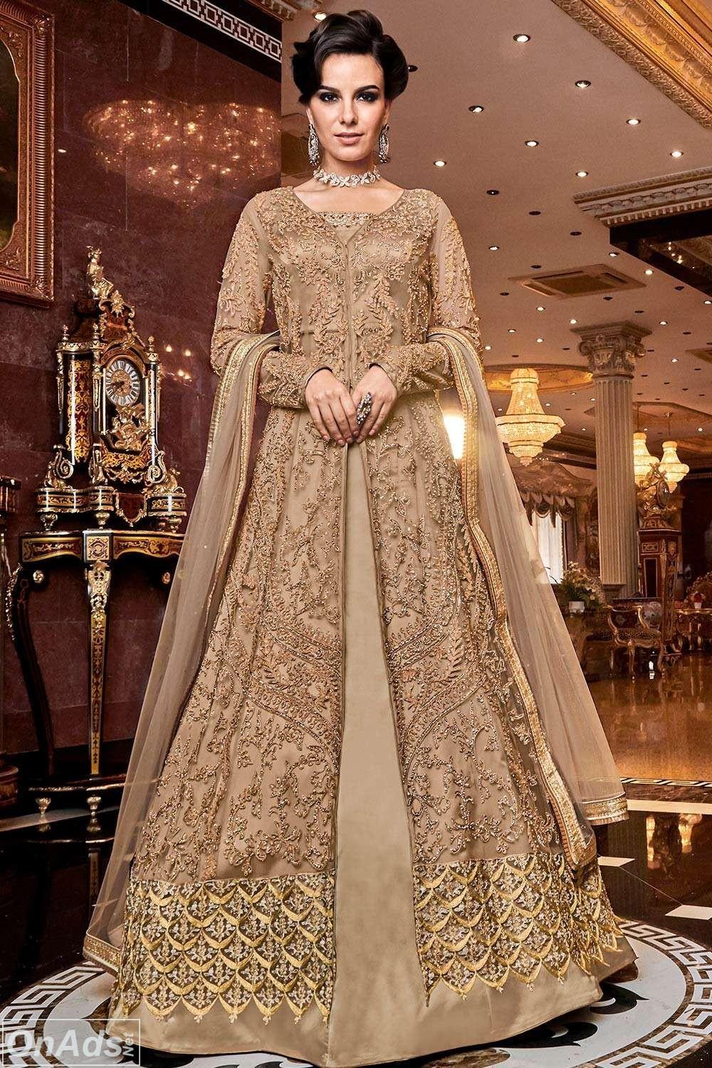 This design is Anarkali Suit with Beige in color which can be customized up to 58" inches bust size.