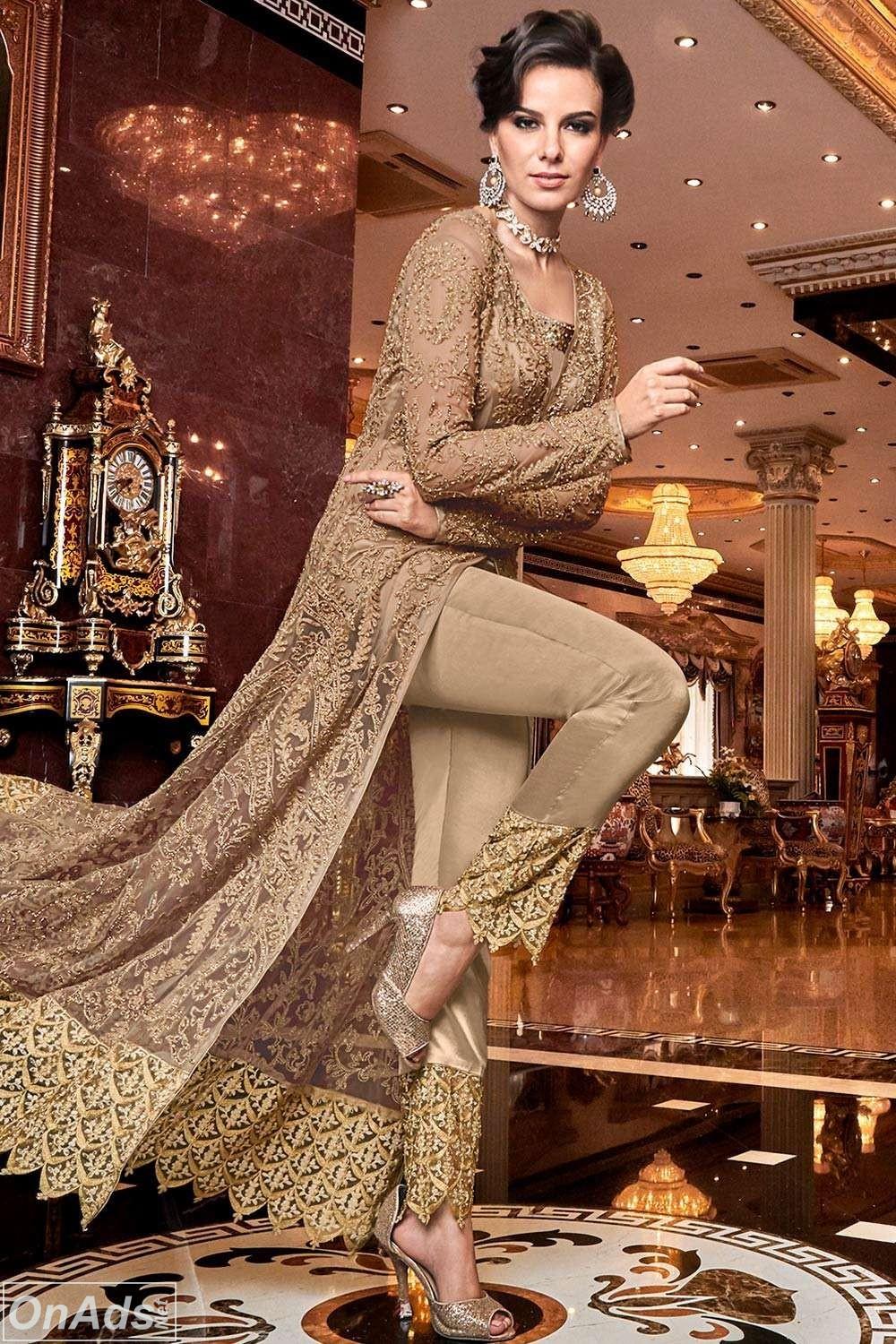 Kameez (top) is made by Net fabric and having Stone, Embroidered work, salwar (bottom) is in Beige color and made by Satin fabric.