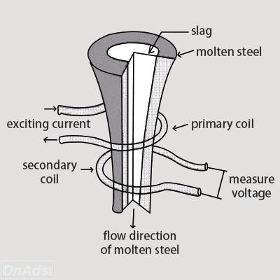The sensor adopts the principle of electromagnetic induction for signal detection, and its typical structure is two concentric coils. When the primary coil is supplied with an intermediate frequency excitation current, due to the action of the magnetic field, an eddy current is generated in the steel flow, and the direction of the magnetic field is opposite to the direction of the magnetic field generated by the coil. Because the conductivity of slag is much lower than that of molten steel at high temperature (about 1/1000), the eddy currents generated in slag are much smaller than those generated in molten steel. In the process of pouring steel, all the molten steel flows out at the beginning of pouring. At the later stage of pouring, there will be steelmaking slag mixing out, which reduces the conductivity of the melt and enhances the electromagnetic field. This signal is measured by the secondary coil.