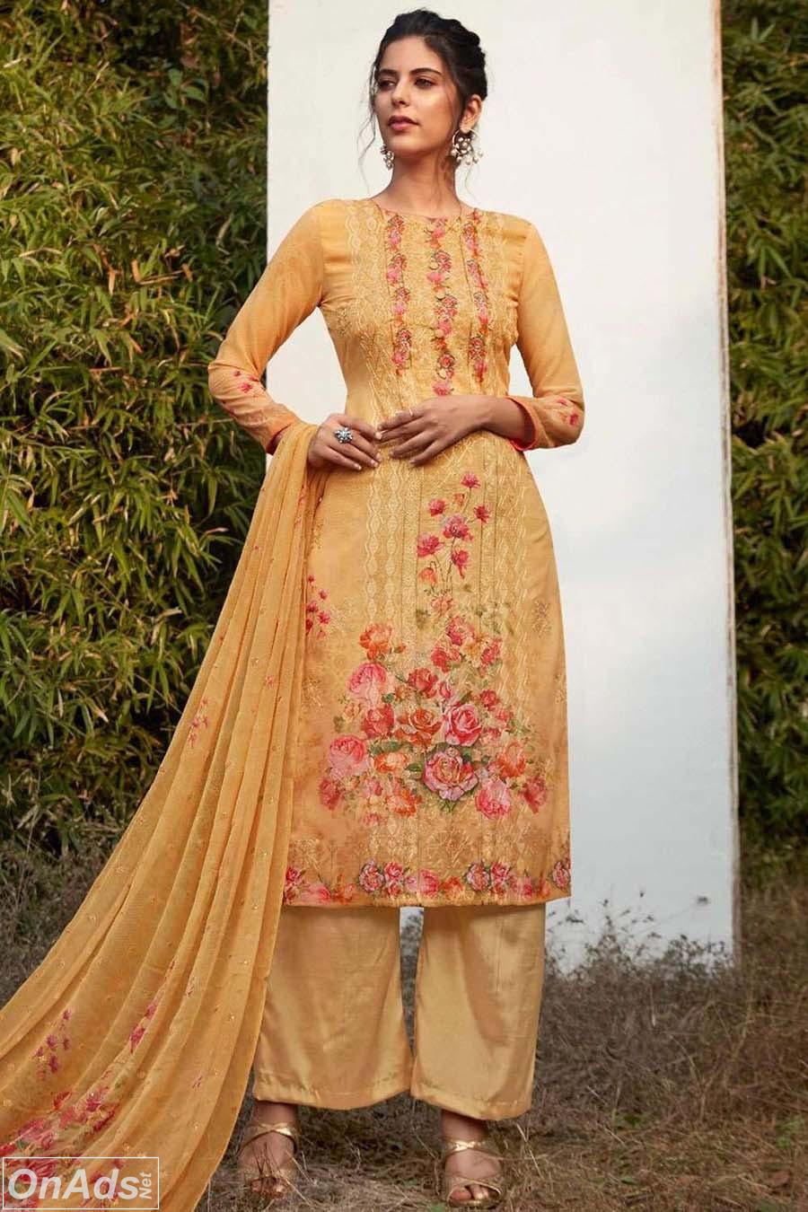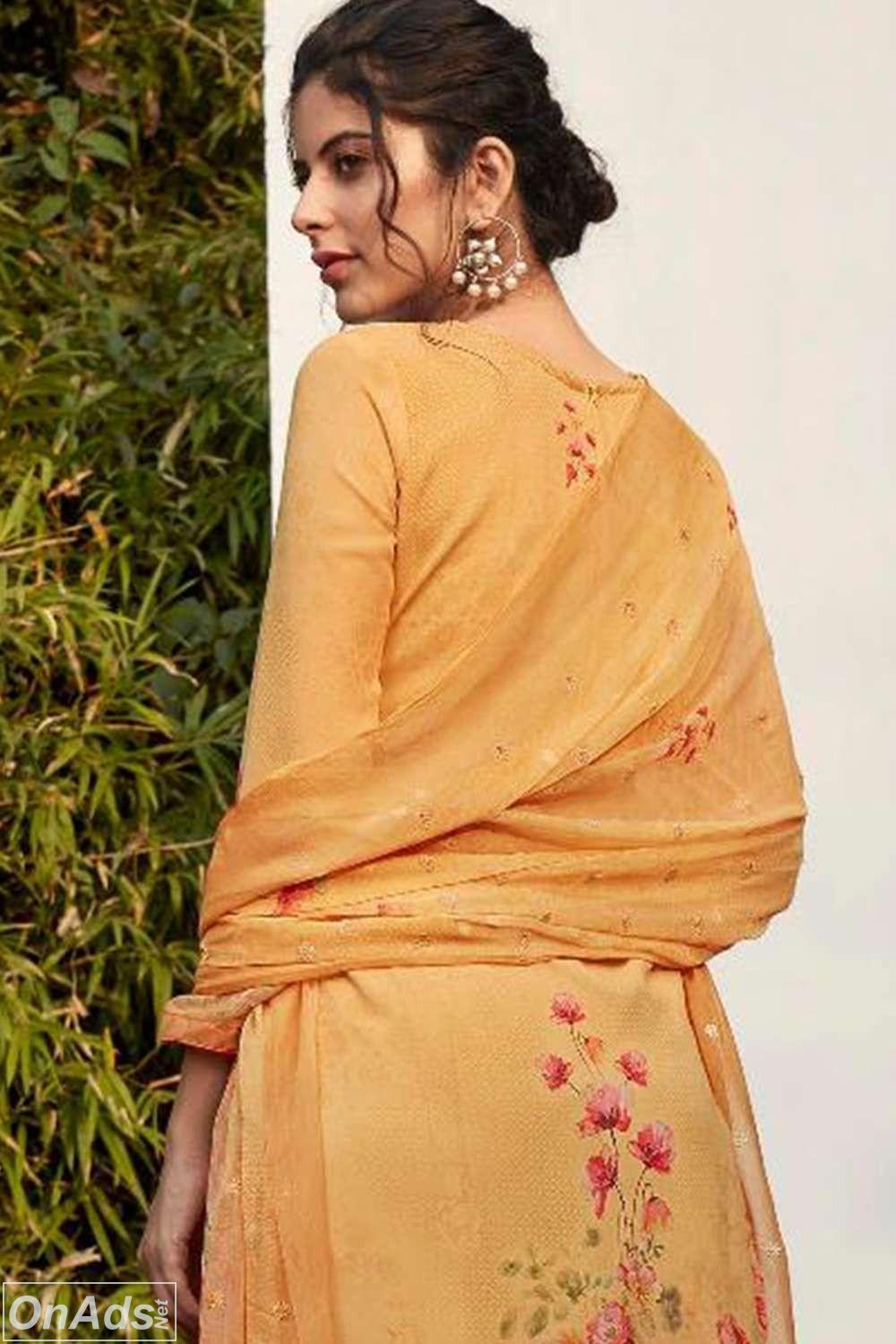 Kameez (top) is made by Georgette fabric and having Thread, Embroidered, Printed work, salwar (bottom) is in Occur Yellow colour and made by Santoon fabric.